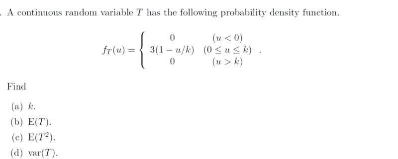 ##E(T)=\int_0^{\frac{2}{3}} u⋅(3-\dfrac{9}{2}u )du=\left[\dfrac{3}{2}×\dfrac{4}{9}-\dfrac{3}{2}×\dfrac{8}{27}\right]=\dfrac{6-4}{9}= \dfrac{2}{9}##Ok let me know if that's correct...