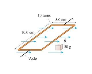 The 10-turn loop of wire shown in the figure lies in a horizontal plane, parallel to a uniform horizontal magnetic field, and carries a 2.0 current. The loop is free to rotate about a nonmagnetic axle through the center. A 50 mass hangs from one edge of the loop.