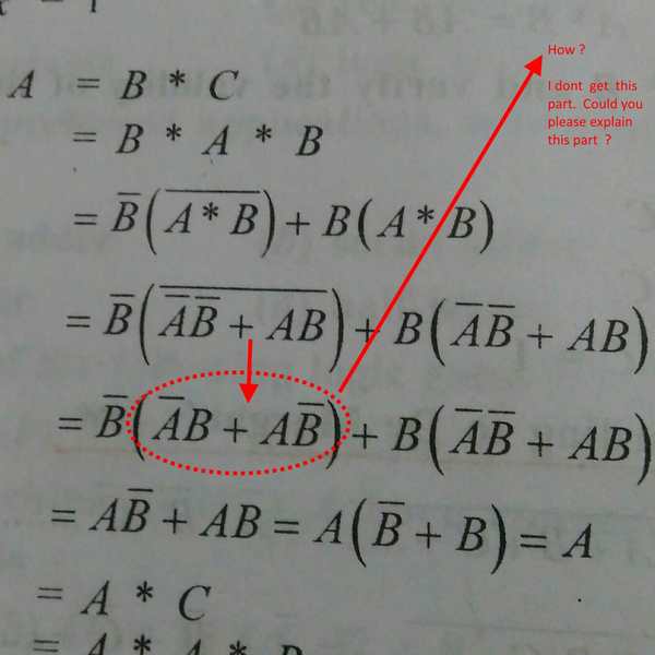 The discussion revolves around a problem statement and solution from a book related to Boolean algebra. Participants seek clarification on specific steps and laws applied in the solution, particularly focusing on the use of DeMorgan's Laws and the properties of Boolean operations.