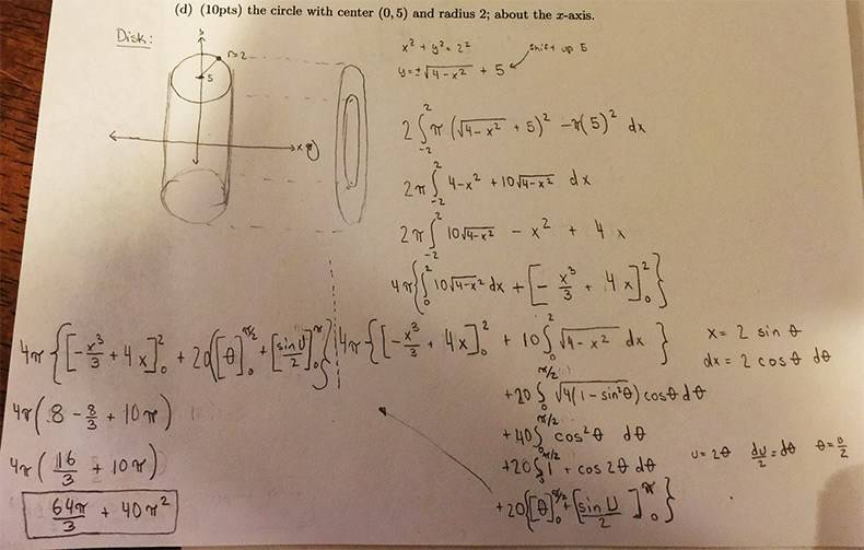 $\displaystyle \begin{align*} 40\pi \int_0^2{\sqrt{4 - x^2}\,\mathrm{d}x} &= 40\pi \int_0^{\frac{\pi}{2}}{ \sqrt{4 - \left[ 2\sin{(t)} \right] ^2 }\,2\cos{(t)}\,\mathrm{d}t} \\ &= 40\pi \int_0^{\frac{\pi}{2}}{\sqrt{4 - 4\sin^2{(t)}}\, 2\cos{(t)}\,\mathrm{d}t} \\ &= 40\pi \int_0^{\frac{\pi}{2}}{ 2\cos{(t)} \, 2\cos{(t)}\,\mathrm{d}t } \\ &= 160\pi \int_0^{\frac{\pi}{2}}{ \cos^2{(t)}\,\mathrm{d}t } \\ &= 160\pi \int_0^{\frac{\pi}{2}}{\frac{1}{2} \left[ 1 + \cos{(2t)} \right] \,\mathrm{d}t} \\ &= 80\pi \int_0^{\frac{\pi}{2}}{1 + \cos{(2t)}\,\mathrm{d}t} \\ &= 80\pi \left[ t + \frac{1}{2}\sin{(2t)} \right]_0^{\frac{\pi}{2}} \\ &= 80\pi \left[ \left( \frac{\pi}{2} + 0 \right) - \left( 0 + 0 \right) \right] \\ &= 80\pi \left( \frac{\pi}{2} \right) \\ &= 40 \pi ^2 \end{align*}$