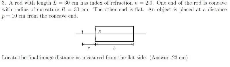 Does anyone know how to solve this problem? I tried using the spherical interface formula (n1/p)+(n2/q)=((n2-n2)/R) and I get q=15cm which I cannot seem to relate to the answer provided (23cm). Anyone know the correct way to approach this problem?