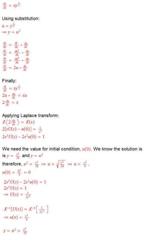 - A suggestion is made to use the substitution u = y^{1/2} to reduce the ODE to a form that could potentially be solved using Laplace transforms.