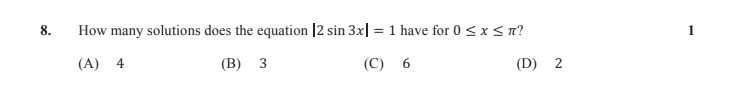 The discussion focuses on solving the equation 2sin(3x) = 1 and 2sin(3x) = -1, leading to sin(3x) = 1/2 and sin(3x) = -1/2. The key issue is determining the number of solutions for these equations within the interval of 0 to 3π. The correct number of solutions is identified as 6, not 3, due to the periodic nature of the sine function across the specified domain.