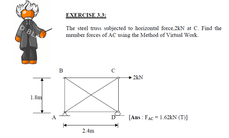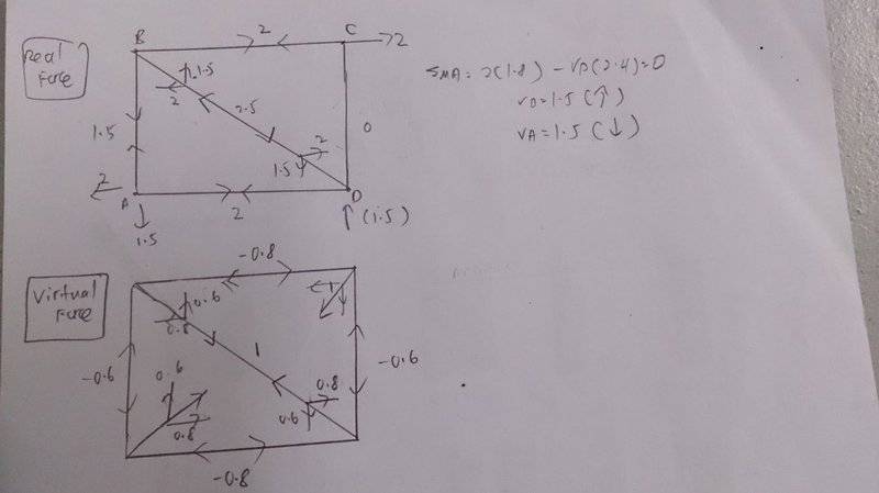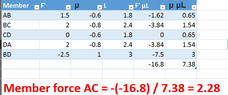 The discussion centers on solving an Internal Indeterminate Truss problem, specifically focusing on the member AC. The user attempted to find the force in member AC by removing it and applying a virtual unit force, resulting in a calculated answer of 2.28. However, the expected answer is 1.62, leading to confusion and a request for assistance in identifying the error in their calculations. The user has verified their work multiple times but remains uncertain about the mistake.