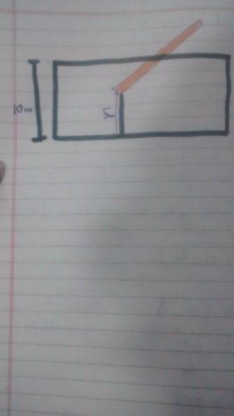 A rod 6 meters in length has specific gravity 25/36. One end of the rod is tied to a 5 meter rope, which in turn is attached to the floor of a pool 10 meters deep. Find the length of the part of rod, which is out of water.