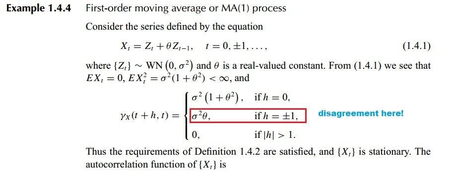 for h = |1|, autocovariance = $\theta \sigma^2 + \theta \sigma^2$ = $2 \theta \sigma^2$ <<< textbook disagrees here!