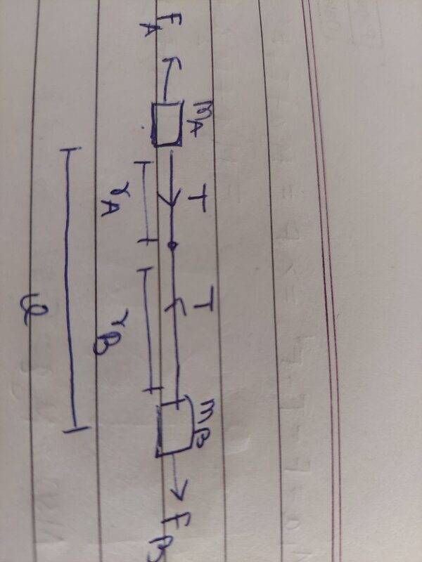 - A disk rotates with constant angular velocity ω. Two masses A & B slide without friction in a groove passing through center of disk. They are connected by string of length 'l' and are initially held in position by catch with mass A at a distance r(A) from the center. Neglect gravity. At t=0 the catch is removed and masses are free to slide. Find r''(A) immediately after catch is removed in terms of A,B,l,r(A) & ω.