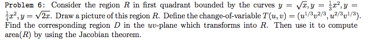The discussion revolves around a change of variables problem involving the transformation T(u,v) and its application to finding the region that transforms into a given region R. Participants are exploring the necessary steps and mathematical expressions required to solve the problem, including the substitution of variables and the calculation of the Jacobian.