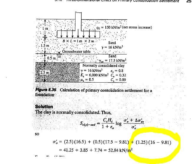 The discussion centers on the calculation of pressure before the construction of a foundation, specifically questioning the formula used: (2.5)(16.5) + (0.5)(17.5-9.81) + (1.25)(16-9.81). Participants debate why pressure is only considered for half of the clay layer, with one user suggesting an alternative formula: (2.5)(16.5) + (0.5)(17.5-9.81) + (2.5)(16-9.81). The consensus indicates a need for clarity on the principles of consolidation pressure in geotechnical engineering.