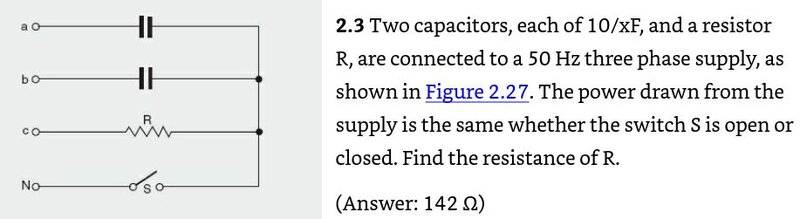 - Two capacitors each of "10/xF" and a resistor are connected to a 50 Hz three phase power supply, as shown in figure 2.27. The power drawn from the supply is the same whether the switch S is open or closed. Find the resistance of R. - See attached file for diagram and original statement