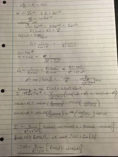 The discussion revolves around solving a differential equation that models the AC response of an inductor, specifically in the context of finding the current when a sinusoidal voltage is applied. The equation in question is L di/dt + iR = V, with V defined as V_0 sin(ωt).