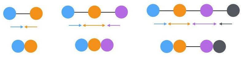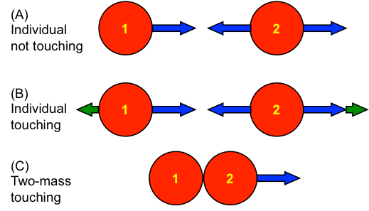 Imagine exactly same two bodies (same mass, same surface/friction etc) are attached with a string/spring and they suddenly start pulling towards each other with equal force. I can imagine they will move towards the center. If there is a chain (with defined number; not infinite) of such bodies attached to each other and each body starts pulling towards each other then would whole system shrink towards the center or just the bodies at the terminal ends because rest of the bodies are experiencing equal and opposite forces. I am stuck.