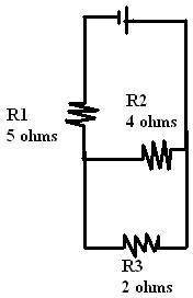 Likewise, if you aren't familiar with that, it's plain to figure it out if you just analize all of the pieces. You know the resistances, so you can find the total resistance using series-parallel equations. You know the current, so you can find the voltage of the power source. Since you know R1 and I1, you can find the voltage drop across R1, and you'll know how many volts are "left over" to be eaten up by the R2/R3 parallel circuit. After that, Ohm's law takes over, and you can find the current in either R2 or R3.