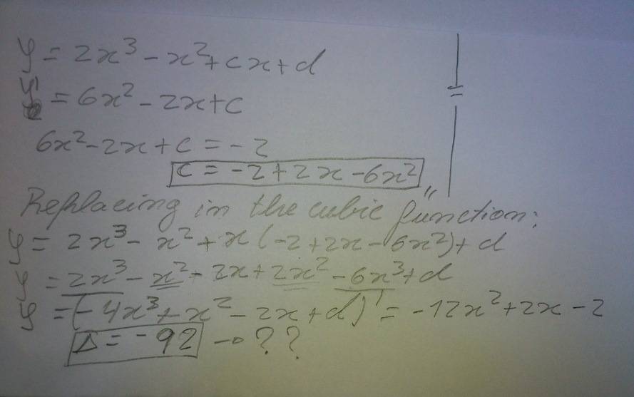 - Several participants suggest equating the derivative of the cubic function to \(-2\) to express \(c\) as a function of \(x\) and find the corresponding \(x\)-values.