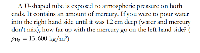 The discussion revolves around a problem involving hydrostatic equilibrium between water and mercury in a tube system. Participants are analyzing the relationship between the heights of water and mercury based on their respective densities and the atmospheric pressure acting on both sides.