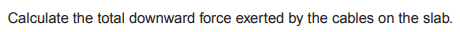 - Participants are attempting to determine the location of the center of mass of the slab and how to calculate the total downward force exerted by the cables. Questions about the specific distances and relationships between forces and distances in the context of static equilibrium are raised.