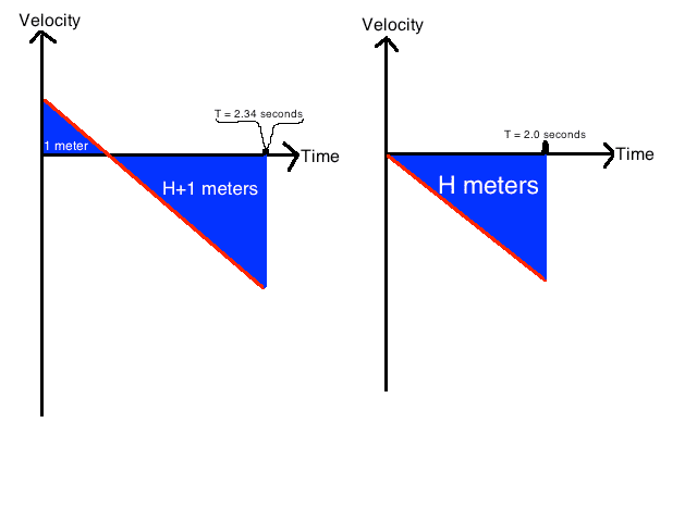 2) Next, she leans over the edge of the cliff and tosses a second rock straight upwards. The rock rises for approximately h = 1.0 m, then falls to the ground below. A time T2 = 2.34 s elapses between the moment the rock leaves her hand and the moment the rock strikes the ground.