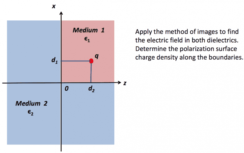 I understand that the question would return to a typical conductor problem when ε2 >> ε1 so for the quadrant one, I placed image charges of q_1 at (d1 , 0 , -d2), -q1 at (-d1 , 0 , -d2) and another q1 at (-d1 , 0 , d2) with q1 = (ε1 - ε2)*q/(ε1 + ε2). When I applies the boundary conditions, I find that the image charges for quadrant two is q - q_1 at (d1 , 0 , d2), -q1 at (-d1 , 0 , -d2) and q1 at (-d1 , 0 , d2), for quadrant four is q - q_1 at (d1 , 0 , d2), -q1 at (-d1 , 0 , -d2) and another q1 at (-d1 , 0 , d2). The boundary conditions are well satisfies with these image charges. However, I failed to find image charges for quadrant three satisfying both the continuity of electric field and voltage at the boundaries connecting it with quadrant two and four. I have been working on this question for days and I am really frustrated. Is my attempt of approach is incorrect? Thank you for any help!