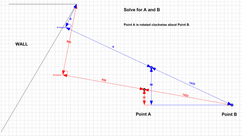 If I was to rotate point A about Point B such that Point A is now 90mm higher then Point B what would my new horizontally and vertical distance to the wall be?