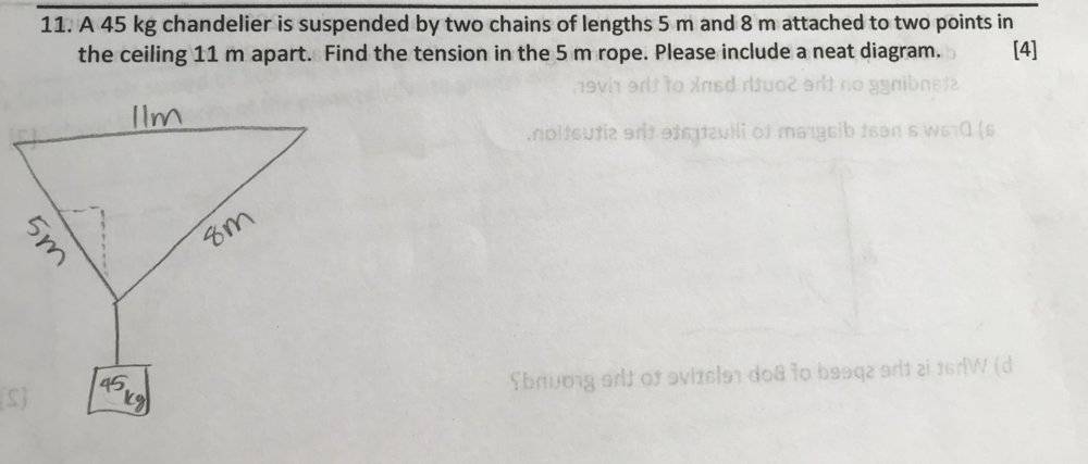 The discussion revolves around determining the tension in a 5m rope supporting a chandelier, which is part of a system involving two chains of different lengths. The chandelier has a mass of 45 kg, and the problem requires understanding the forces acting on it in a static scenario.