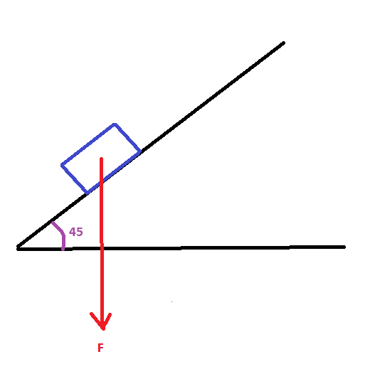 We suppose that a force $\overrightarrow{F}$ (for example, the gravity) is applied vertically downwards to an object that is placed at a plane which has an angle of $45^{\circ}$ with the horizantal direction.