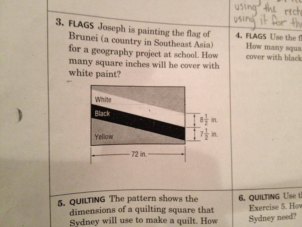 There appears to be agreement among participants regarding the identification of the white stripe as a parallelogram and the use of the dimensions provided for area calculation. However, the discussion does not resolve whether these dimensions are the only or correct ones to use.