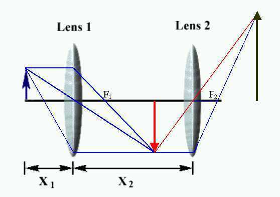 In the figure are shown two converging lenses with x2 = 1 m. The lens on the left (Lens 1) has a focal length of 0.25 m while the one on the right (Lens 2) has a focal length of 0.2 m. An object 3.9 cm high is located x1 = 0.397 m to the left of Lens 1.