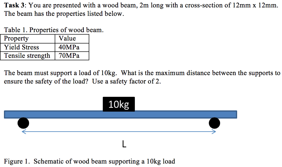 ; Given a beam $2m$ long with a cross section of 12x12mm with a yield stress of $40MPa$ and a tensile Strength of $70MPa$ with a safety factor of two what is the maximum distance between the supports?