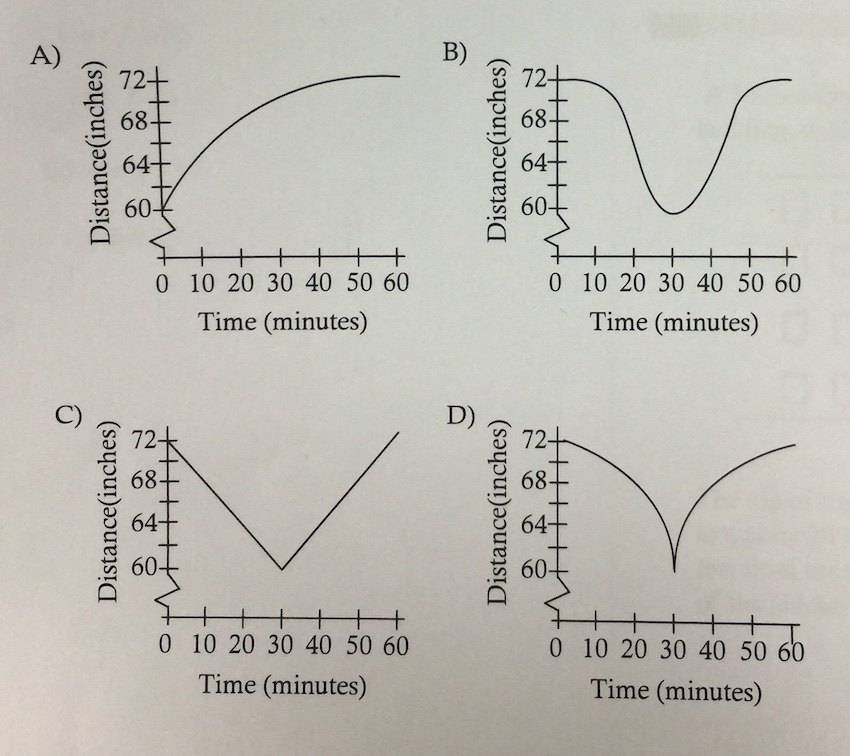 The circular clock has a diameter of 14 inches and its minute had has length 6 inches. It is placed on the wall so that the center of the clock is 66 inches above the ground. Which of the following graphs could represent the distance from the tip of the arrow of the minute hand to the ground with respect to time from 10 a.m. to 11 a.m.?