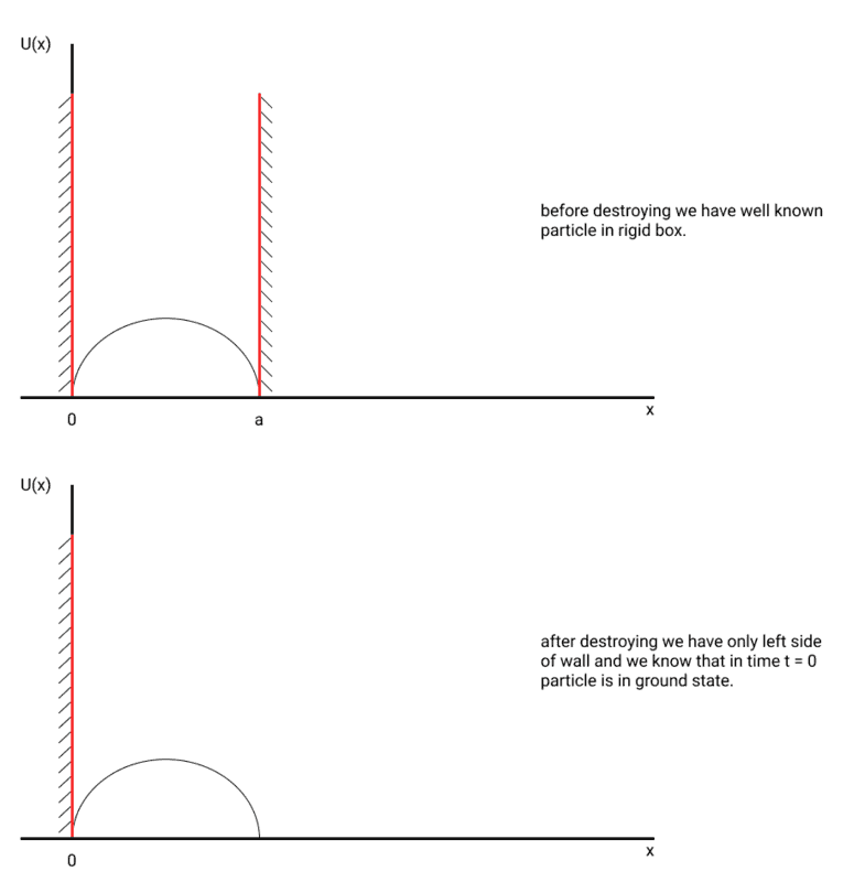 The discussion focuses on solving the quantum mechanics problem of a particle in a rigid box when one wall is destroyed at time t=0. The initial wavefunction, ψ(0), is set to zero at the left wall, indicating the particle is in its ground state. To find the evolution of ψ(x, t), the wavefunction must be expanded in terms of free particle plane waves with positive momentum, while considering the boundary conditions imposed by the remaining wall. The absence of translation symmetry means momentum is not a good quantum number, but momentum squared remains valid, allowing for the combination of eigenfunctions of both positive and negative momentum to satisfy the Hamiltonian's boundary conditions.