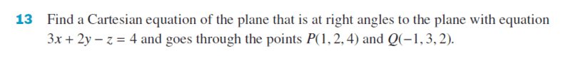 - Find a Cartesian equation of the plane that is at right angles to the plane with the equation 3x + 2y - z =4 and goes through the points P(1, 2, 4) and Q(-1, 3, 2).