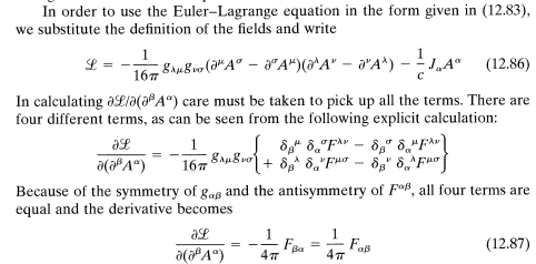 (2) $$\frac {\partial L}{\partial A^\alpha}=-2\beta A_\mu (\partial_\rho A^\rho)$$