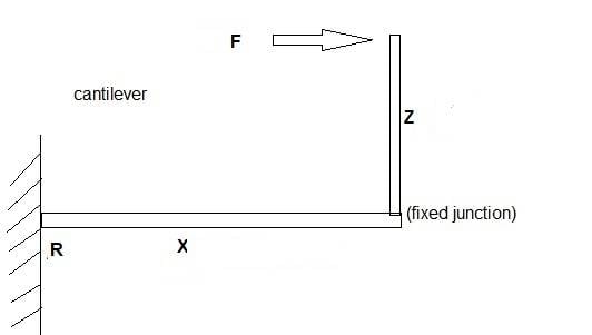 The discussion revolves around determining the shear force (SF) and bending moment (BM) at a reaction point R on a cantilever beam subjected to a horizontal force applied at the top of a vertical member Z. Participants explore the implications of this setup on the beam's behavior, including the effects of vertical and horizontal forces, and the resulting diagrams for shear and moment.
