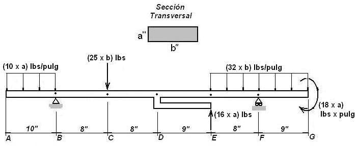 - Figure shows a supported beam, where a=2 and b=3, and the cross section is a rectangle with the sides a=2 in and b=3 in. Determine the support reactions, maximum normal and shearing stresses. Draw the shearing force and bending moment diagrams.