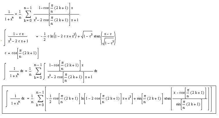 \int \frac{dx}{x^N+ a}=\sum _{k=0}^{N-1} b_k\ln \left(x-(-a)^{\frac{1}{N}}e^{\frac{2k \pi }{N}i}\right)