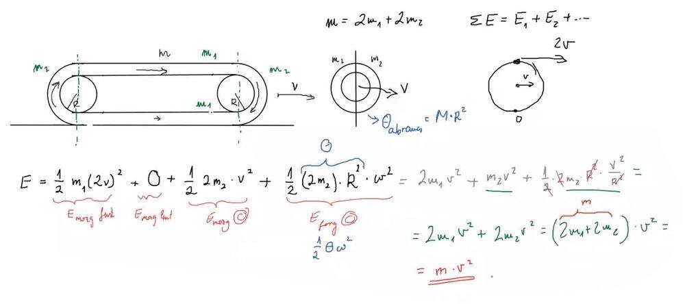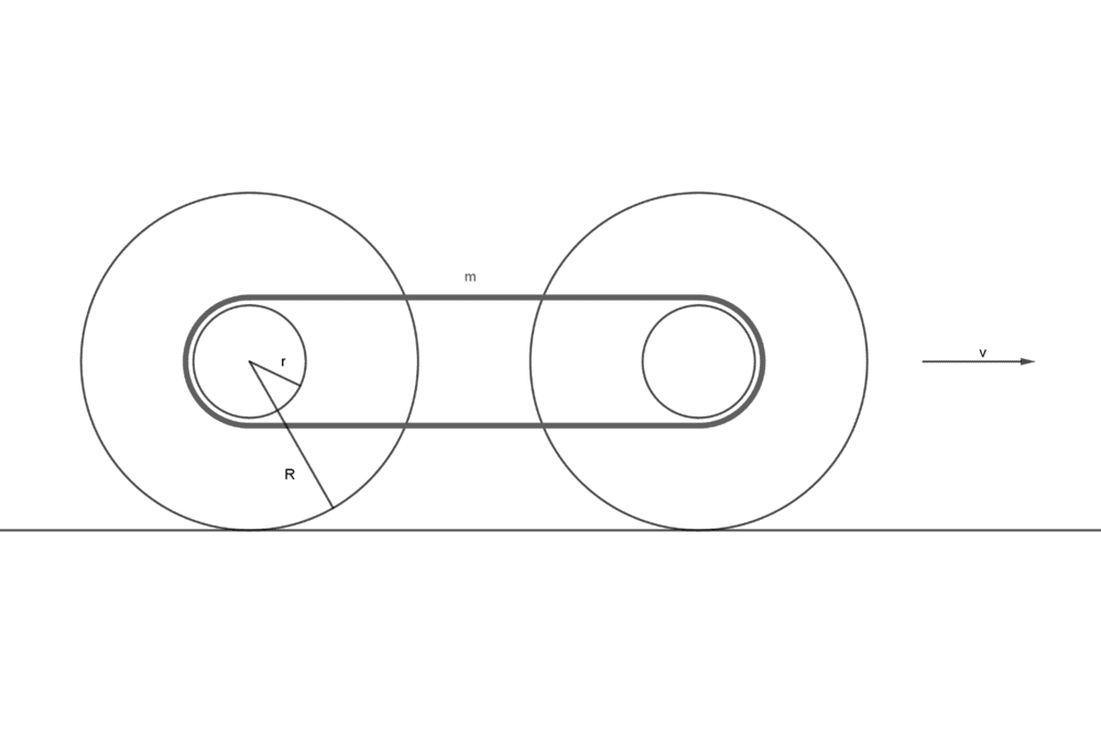 Calculate the energy of the chain shown in the figure, if the center of gravity (center of mass) of the rollers travel with v speed.The weight of the rollers are negligible, the chain is considered inextensible, but perfectly flexible. The weight of the chain is m.