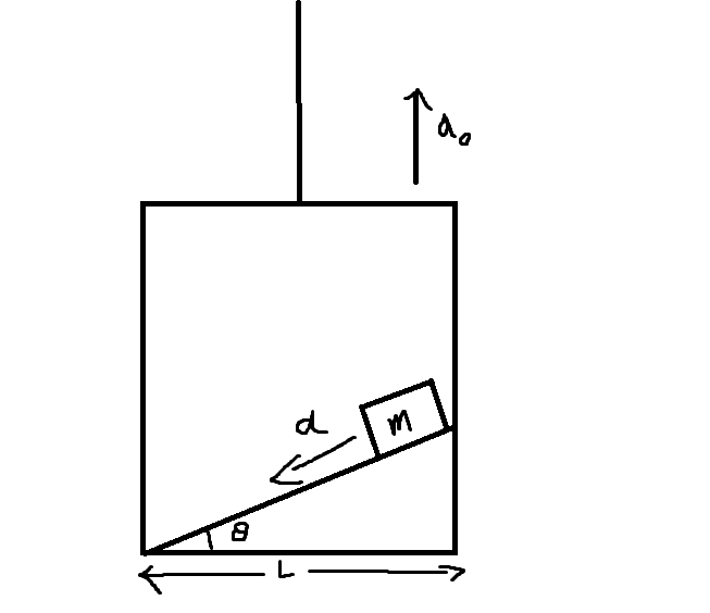 I don't know how to go about solving this from an inertial frame. In my view, the only two forces acting on this block are mg, which has a mgsin(theta) component along the plane and the normal force acting on the block however, the normal force has no component along the plane and hence it wouldn't affect the acceleration. This gives an acceleration of gsin(theta) which I know is the wrong answer. This question is easy to solve when we're in the FOF of the elevator ie an accelerated frame but I'm not able to figure out how to solve for the acceleration from an inertial frame. Once the acceleration is found the rest of the problem is pretty straightforward.