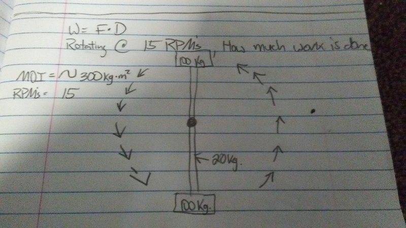Do you want work done or kinetic energy?Pinon1977 said:10 feet in length ...excludng the support feature of 20kg, the 100kg mass on each end has a moi of 231 and 286j.