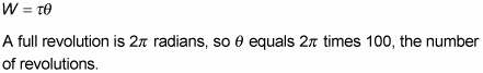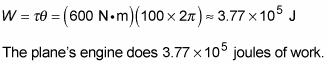 Say that you have a plane that uses propellers, and you want to determine how much work the plane’s engine does on a propeller when applying a constant torque of 600 Newton-meters over 100 revolutions. You start with the work equation in terms of torque: