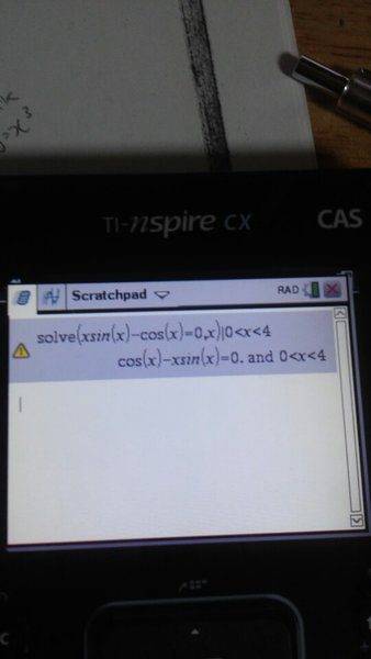 The discussion revolves around solving the trigonometric equation xsin(x) - cos(x) = 0 within the interval (0, 4) using a TI-Nspire CX calculator. Participants are exploring the challenges faced when attempting to find solutions through the calculator's algebraic functions.