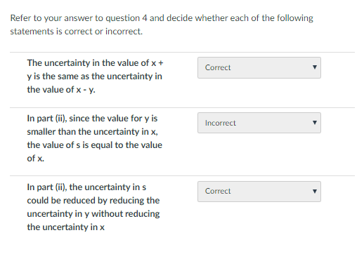 I answered incorrect to this one, because the uncertainty could be either positive or negative. However adding y to x will result in x being increased positively. Therefore, I considered this to be false.
