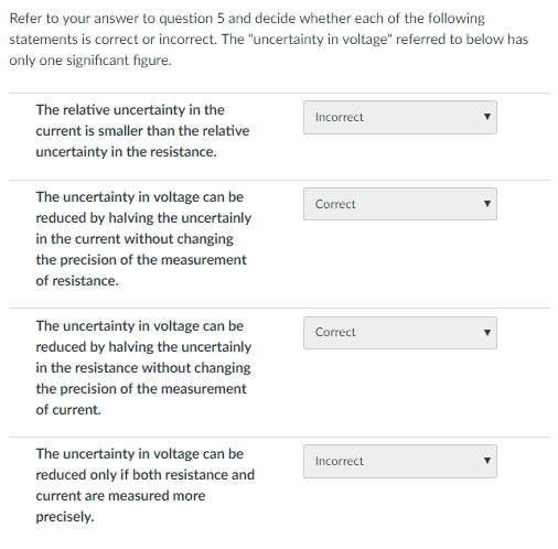I answered false to this, as this contradicted my logic for the previous two questions. Reducing uncertainty in at least the current should decrease the uncertainty in the voltage.