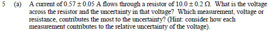 I calculated the relative uncertainty to be about 8.8%. This is from ∆x/x = 0.05/0.57 ≈ 0.088. The relative uncertainty for the resistance is 0.2/10=0.02. Therefore the current has a higher relative uncertainty. I answered false to this one.