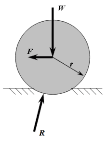 Torques. Due to the hysteresis, the normal force is not alligned with the weight. Let's assume for now that ##d## is known since we should be able to approximate it from the properties of the material. Also, due to the deformation of the wheel, the force ##F## has a smaller leverage ##r## instead of ##R##.