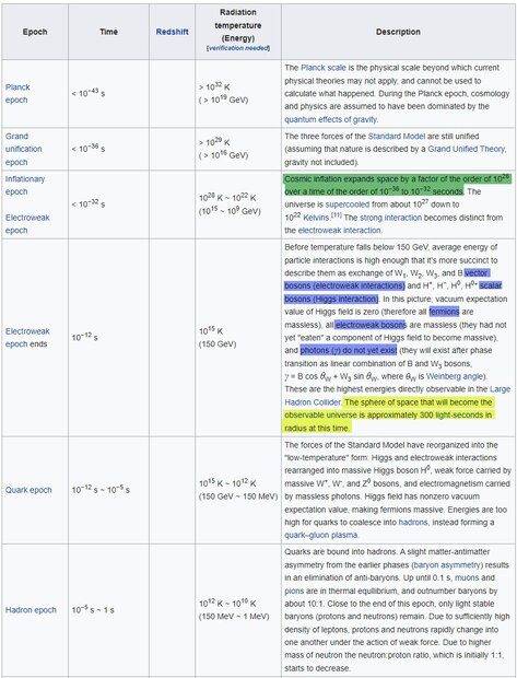 For the epoch titled "Electroweak epoch ends" around 10^-12 second, in yellow highlight, it says "The sphere of space that will become the observable universe is approximately 300 light-seconds in radius at this time".