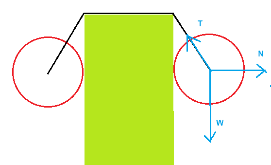 Imagine a tall block of wood sitting on the ground. Then imagine a rope resting on the block with both ends dangling off both sides of the block. Then someone attaches a ball to both ends of the rope. Assume the balls are equal in mass, thus the system is in equilibrium. Now the middle of the rope is still resting on the top of the block, but the ends are now spanned out, say 45 degrees, along the sides of the block because of the radius of the balls attached to the ends of the rope that are hanging off the sides of the block, but not touching the ground. Also assume no friction anywhere.
