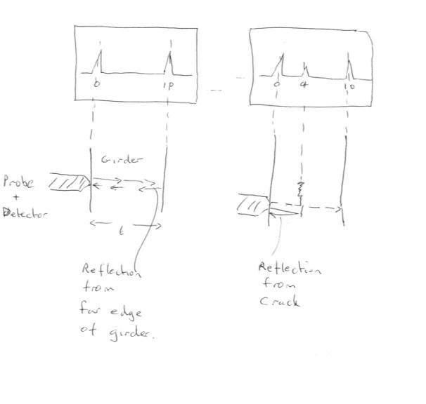 my understanding: there is a crack in the girder so when the sound waves is sent in, some of the waves will have to go around it so it causes it to be slower than the sound waves which do pass the crack. because it is slower, so it is shown in the 4 microseconds. meaning that if another pulse is sent out one of the recorded one will be at 10microseconds from the previous one and another which is 4 microseconds ahead of just detected pulse