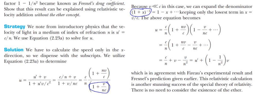 The discussion revolves around a potential discrepancy in a textbook regarding the expression for a variable in the context of special relativity and Fresnel's drag coefficient. Participants are examining the implications of using different forms of the variable, specifically comparing x = v/c and x = v/(nc).