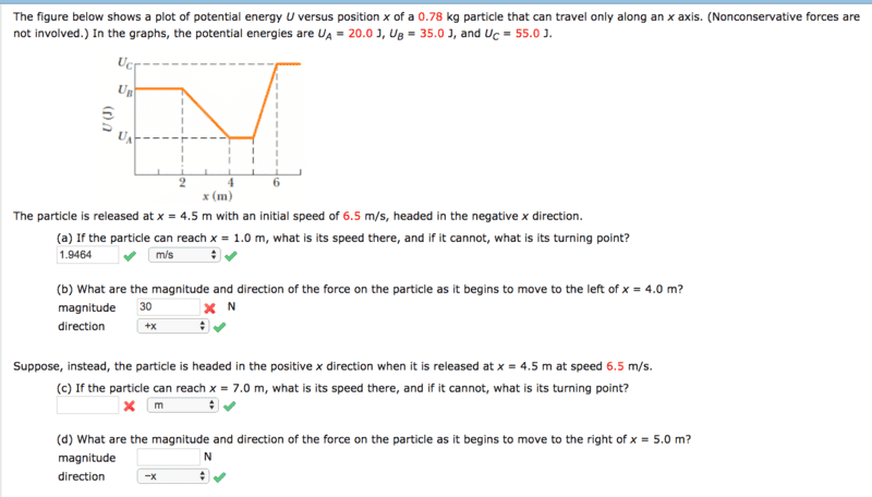 As you can see, I did get (a). (The other checkmarks, I guessed — there were only two possible choices for each, anyway.) KEi = KEf + 15, and by plugging in appropriate numbers, I was able to get v = 1.9464 m/s.