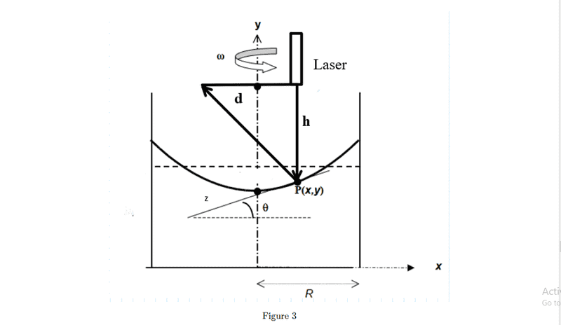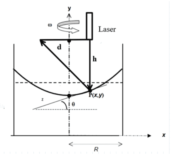 Now, consider a laser placed at h height directly above the point is emitting a beam vertically downwards. After reflection, it reaches the height of the laser with d horizontal distance from the source. We can get the slope from the values of d and h. And ω can be measured by finding the time it takes to rotate 20 times. These data are tabulated below, here h = 13 cm , R = 7.25 cm.